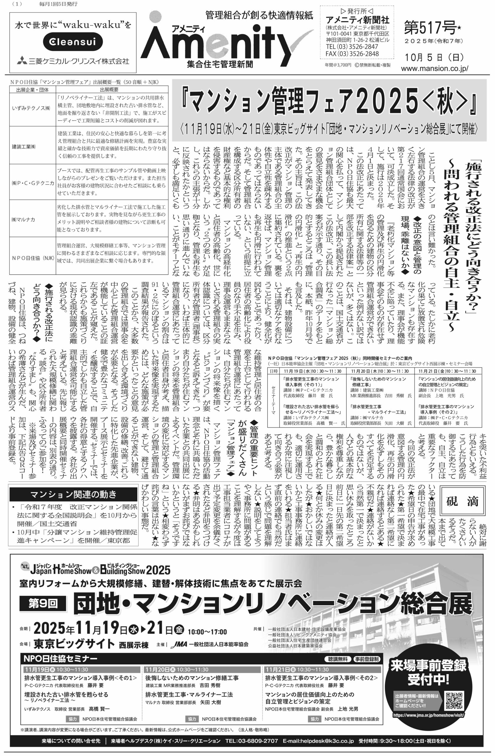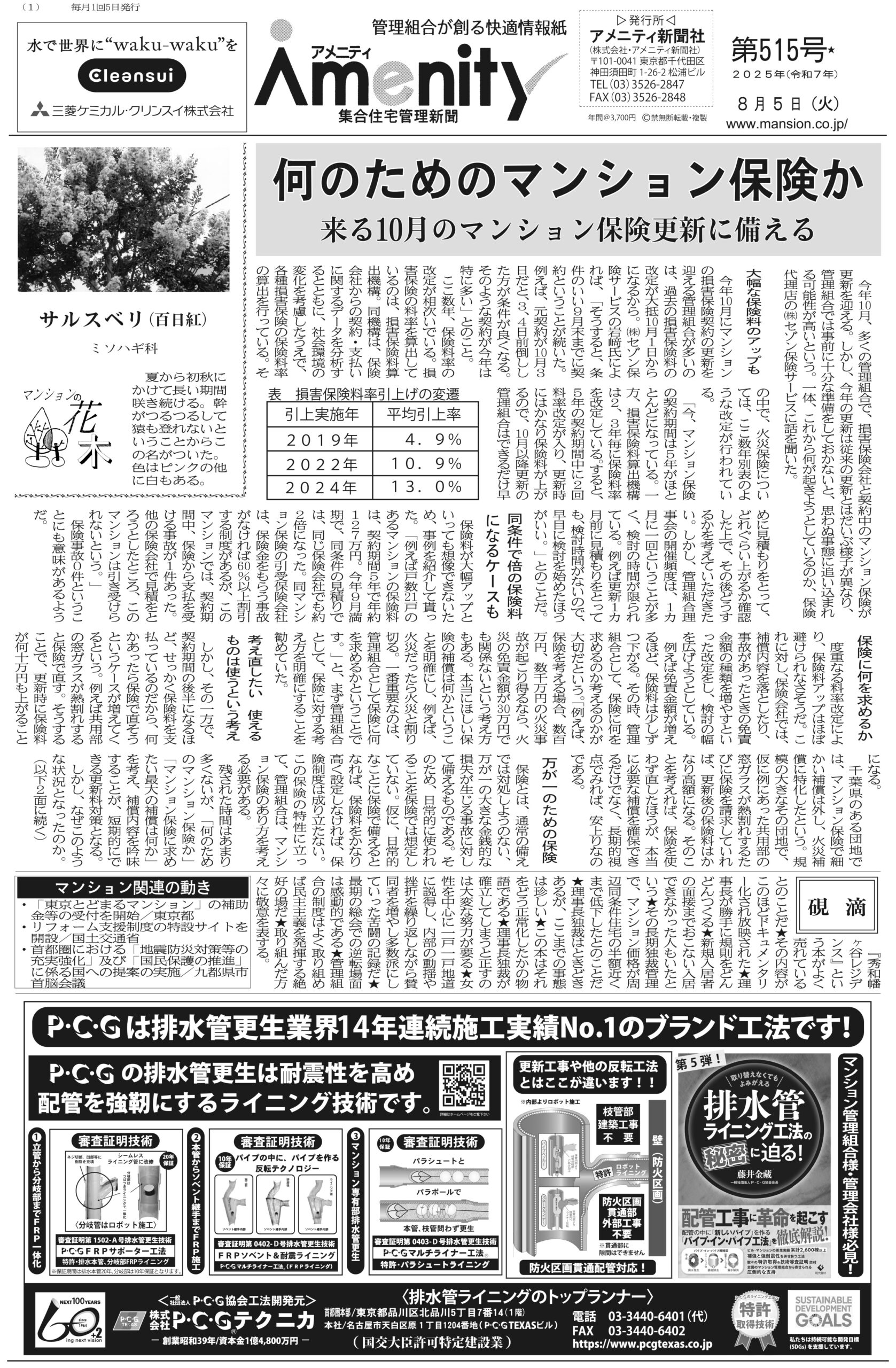 「アメニティ」のバックナンバー 2025年のバックナンバー 第508号(2025年1月5日) 第509号(2025年2月5日) 第510号(2025年3月5日) 第511号(2025年4月5日) 第512号(2025年5月5日) 第513号(2025年6月5日) 第514号(2025年7月5日) 第515号(2025年8月5日) 第516号(2025年9月5日) 第517号(2025年10月5日)