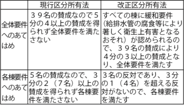 各棟要件については積極的に賛成を数えるのではなく、区分所有者及び議決権の各3分の1を超える「反対」がない場合には要件を満たすとのルールに変更される。この結果、現行区分所有法では賛否不明者を反対としてカウントしていたところが、改正区分所有法では賛否不明者を反対にはカウントしないことになる(同法70条1項ただし書)。実質的に各棟要件は緩和されると評価できる。