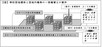 改正区分所有法ではこれまで非常に読みづらかった団地の読み替え規定に読み替え表が導入され現行区分所有法よりも条文がやや読みやすくなっている(改正区分所有法66条)。また、団地内建物の建替え承認決議については、出席者多数決が導入されており、団地管理組合の集会において出席区分所有者及び出席議決権の各4分の3以上の賛成(定足数あり)により建替え承認決議が成立するとされた(同法69条)。さらに、団地内建物の一括建替え決議と同様の要件で、団地内建物敷地売却決議ができることになった(同法71条)。(つづく)